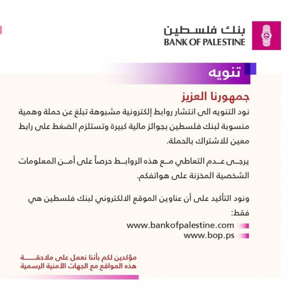 أكد بنك فلسطين، أن هناك روابط الكترونية مشبوهة تبلغ عن حملة وهمية منسوبة الى بنك فلسطين، بجوائز مالية كبيرة، وتستلزم الضغط على رابط معين للاشتراك بالحملة.