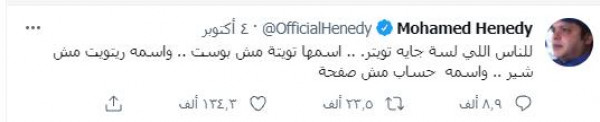 وكتب هنيدي عبر حسابه الخاص في (تويتر): "للناس اللي لسة جايه تويتر.. اسمها تويتة مش بوست.. واسمه ريتويت مش شير.. واسمه حساب مش صفحة"، وفق (لها).