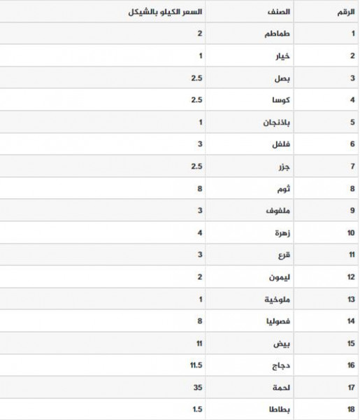 جاءت أسعار الخضروات والفواكه والدجاج واللحوم في قطاع غزة اليوم الخميس كما يلي: