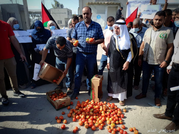 وخلال الوقفة الاحتجاجية، أتلف المزارعون والتجار كميات من البندورة التي يضع الاحتلال شروطا تعجيزية أمام مرورها عبر المعبر الوحيد لقطاع غزة معبر كرم أبو سالم.