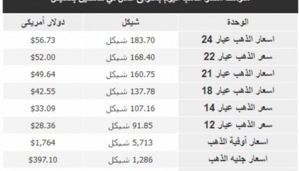 أسعار الذهب في أسواق فلسطين