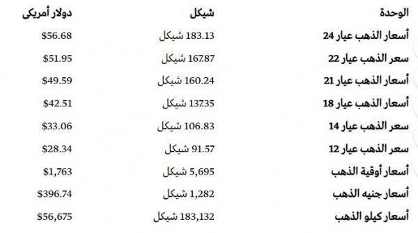 جاءت أسعار الذهب في أسواق فلسطين، اليوم الأربعاء، وفقًا للشيكل الإسرائيلي والدولار الأمريكي على النحو التالي: