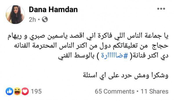وكتبت دانا حمدان، عبر حسابها الخاص على موقع التواصل الاجتماعي (فيس بوك): "يا جماعة الناس اللي فاكرة إني أقصد ياسمين صبري وريهام حجاج من تعليقاتكم، دول من أكتر الناس المحترمة، الفنانة دي أكثر فنانة ضارة بالوسط الفني، شكرًا مش هرد على أي أسئلة".