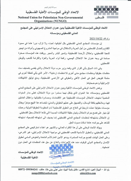 أصدر الاتحاد الوطني للمؤسسات الأهلية الفلسطينية، بياناً أدان من خلاله عدوان الاحتلال الإسرائيلي على المجتمع المدني الفلسطيني ومؤسساته.