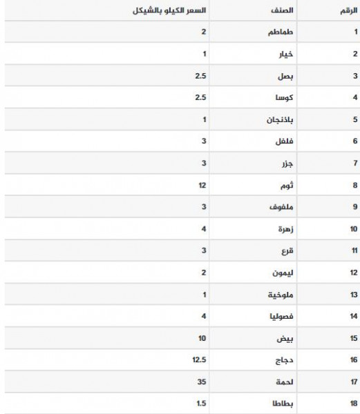 جاءت أسعار الخضروات والفواكه والدجاج واللحوم في قطاع غزة اليوم السبت كما يلي: