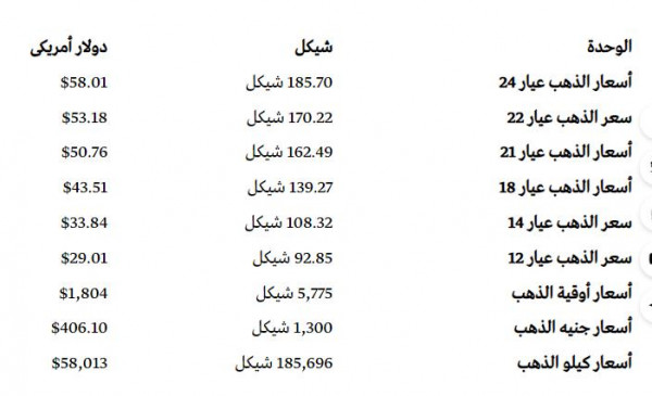جاءت أسعار الذهب في الأسواق الفلسطينية، اليوم الثلاثاء، وفقًا للشيكل الإسرائيلي والدولار الأمريكي على النحو التالي: