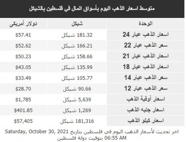 جاءت أسعار الذهب في أسواق فلسطين، اليوم السبت، وفقًا للشيكل الإسرائيلي والدولار الأمريكي، على النحو التالي: