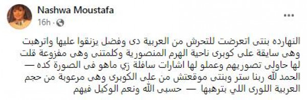 وعلقت مصطفى على الصورة قائلةً: " النهارده بنتي اتعرضت للتحرش من العربية دي وفضلوا يزنقوا عليها واترهبت وهى سايقة على كوبرى ناحية الهرم المنصورية».