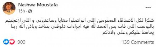 وشكرت الفنانة المصرية كل من ساندها، حيث قالت: " شكرا لكل الأصدقاء المحترمين اللي اتواصلوا معايا وساعدونى، واللي أزعجتهم بالبوست اللى فات بس الحمد لله فيه اجراءات دلوقتى بتتاخد وباذن الله ربنا يحافظ عليكم وعلى ولادكم".