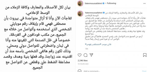 نشرت الإعلامية اللبنانية فاتن موسى عبر صفحتها الخاصة على تطبيق تبادل الصور(انستغرام)، بياناً جديداً صرحت خلاله عن أن زوجها السابق مصطفى فهمي قام بإيقاف رقم هاتفها الشخصي أثناء فترة إقامتها الحالية في بيروت.