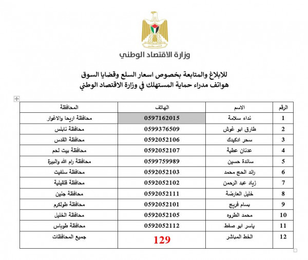 قالت وزارة الاقتصاد الوطني إن الرقم المباشر لشكاوى المواطنين رقم" 129" تلقى عشرات الشكاوى التي أسهمت في ضبط واستقرار الأسعار في الأسواق، التي شهدت ارتفاعا غير مبرر في أسعار بعض السلع الأساسية.