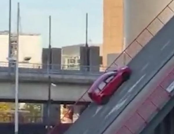 ونتيجة لذلك، مع استمرار الجسر في الارتفاع، بدأت السيارة في النهاية بالانزلاق للخلف، قبل أن تصطدم بالطريق العام وتنقلب.