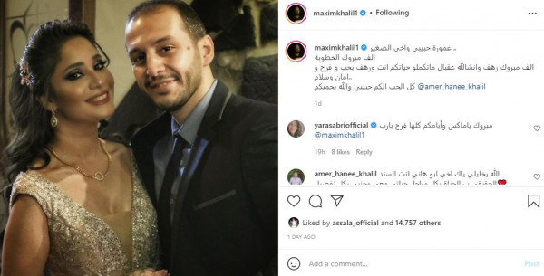 نشر الفنان السوري مكسيم خليل عبر حسابه الخاص على تطبيق تبادل الصور(انستغرام)، صورة لشقيقه وعروسه لتهنئتهما بالخطوبة.