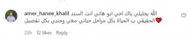 وردّ شقيقه عامر بتعليق كتب فيه: "الله يخليلي ياك أخي أبو هاني أنت السند الحقيقي بالحياة بكل مراحل حياتي معي وجانبي بكل تفصيل".
