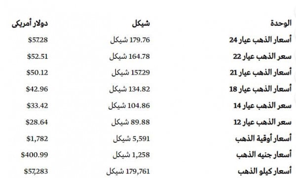 جاءت أسعار الذهب في الأسواق الفلسطينية، اليوم الأربعاء، وفقًا للشيكل الإسرائيلي والدولار الأمريكي على النحو التالي: