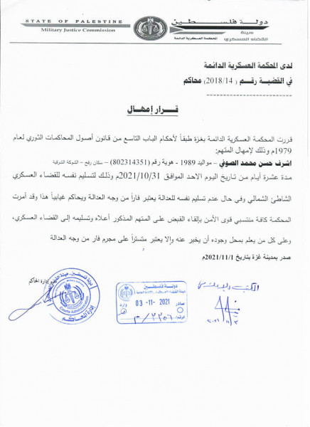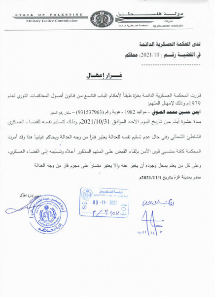 أمهلت المحكمة العسكرية الدائمة، التابعة لهيئة القضاء العسكري، بغزة، المتهم/ أشرف حسن محمد الصوفي، هوية رقم (802314351) ، والمتهم/ أيمن حسين محمد الصوفي، هوية رقم (931537963)، من رفح، عشرة أيام من تاريخ يوم الأحد الموافق 31/10/2021م، لتسليم نفسيهما للقضاء العسكري.