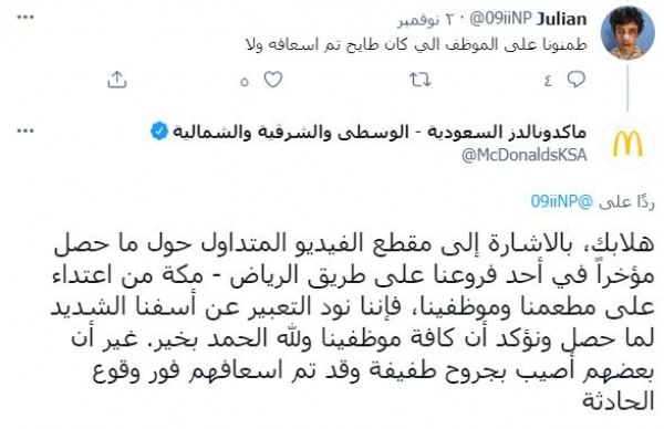 وأوضحت الشركة ردها على أحد المواطنين كان يسأل عن وضع الموظفين الذين تعرضوا للضرب، وقالت: " إننا نود التعبير عن أسفنا الشديد لما حصل ونؤكد أن كافة موظفينا ولله الحمد بخير