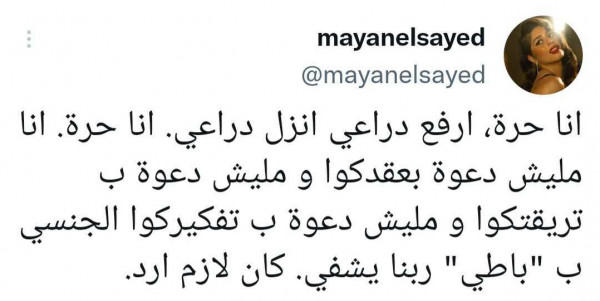 وردت السيد عبر حسابها في موقع التواصل الاجتماعي (تويتر) بتغريدة غاضبة قالت فيها: "أنا حرة أرفع أنزل دراعي، أنا مليش دعوة بعقدكوا ومليش دعوة بتريقتكوا ومليش".