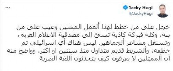 وقال هوجي في تغريدة عبر صفحته في موقع التواصل الاجتماعي (تويتر): "خجل على من خطط لهذا العمل المشين، وعيب على من بثه، فكله فبركة كاذبة تسيء إلى مصداقية الإعلام العربي، وتستغل مشاعر الجماهير".