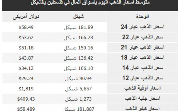 سُجلت أسعار الذهب في أسواق فلسطين، اليوم الأحد، الموافق 7 تشرين الثاني/ نوفمبر 2021، وفقًا للشيكل الإسرائيلي والدولار، على النحو التالي: