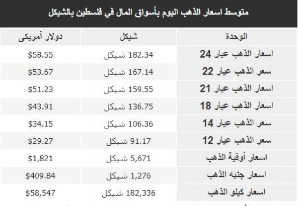 سُجلت أسعار الذهب في أسواق فلسطين، اليوم الاثنين، الموافق 8 تشرين الثاني/ نوفمبر 2021، وفقًا للشيكل الإسرائيلي والدولار، على النحو التالي: