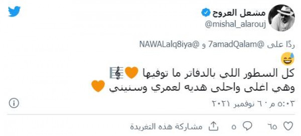 وأيضاً كتب: كل السطور اللي بالدفاتر ما توفيها، وهي أغلى وأحلى هدية لعمري وسنيني. وقد تفاعل الفنانون والمتابعون وقدموا تهانيهم لهما.