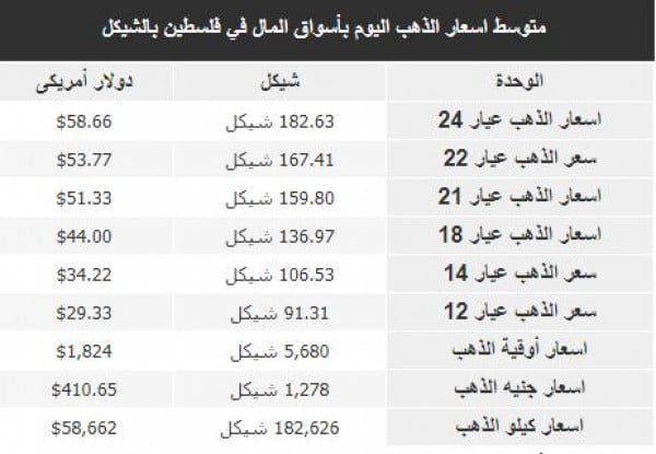 سُجلت أسعار الذهب في أسواق فلسطين، اليوم الثلاثاء، الموافق 9 تشرين الثاني/ نوفمبر 2021، وفقًا للشيكل الإسرائيلي والدولار، على النحو التالي: