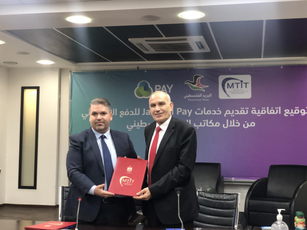 وقعت وزارة الاتصالات وتكنولوجیا المعلومات الفلسطينية، والشركة الوطنية للدفع الإلكتروني JAWWAL PAY، اتفاقیة تعاون يتم بموجبها تقدیم خدمات الدفع الإلكتروني للمحفظة في مكاتب البرید الفلسطیني.