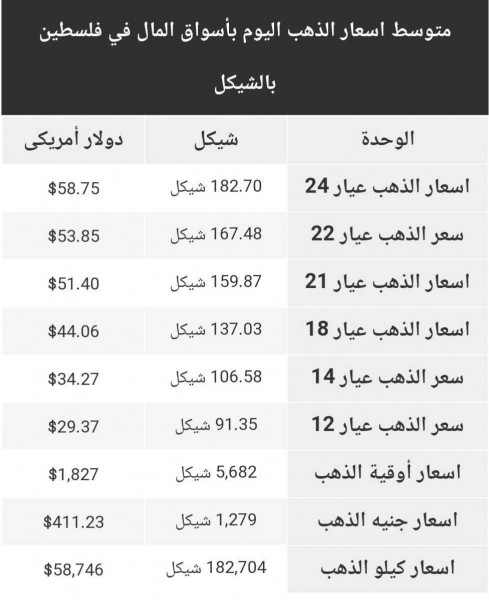 سُجلت أسعار الذهب في أسواق فلسطين، اليوم الأربعاء، وفقًا للشيكل الإسرائيلي والدولار، على النحو التالي: