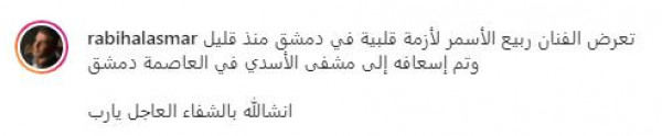 نشر الفنان اللبناني ربيع الأسمر على حسابه الخاص على تطبيق تبادل الصور(انستغرام)، مجموعة صور له وهو على سرير غرفة الطوارئ في مستشفى الأسد في العاصمة السورية دمشق.