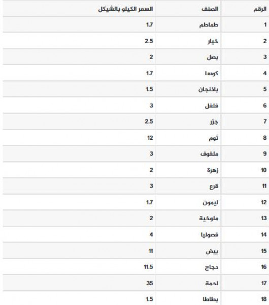 نشرت وزارة الزراعىة، متوسط أسعار المنتجات الزراعية بالشيكل لليوم السبت بحيث لا تزيد الأسعار عن المدونة أدناه للمستهلك.