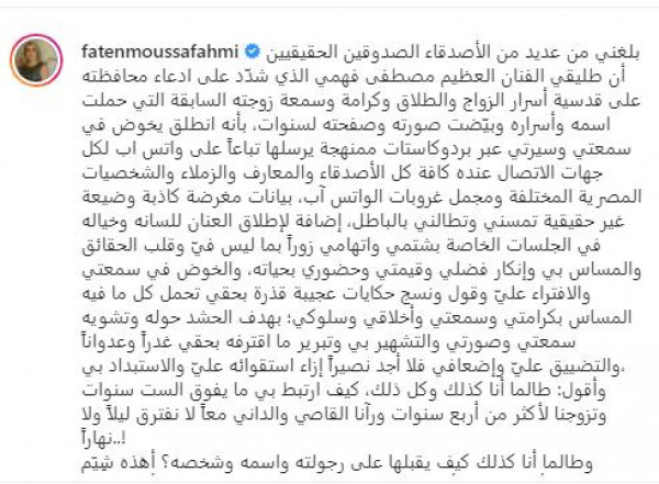 نشرت الإعلامية اللبنانية فاتن موسى عبر حسابها الخاص على تطبيق تبادل الصور(انستغرام)، بياناً لأحدث التطورات في علاقتها مع طليقها مصطفى فهمي.