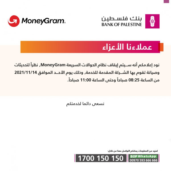 بنك فلسطين: إيقاف نظام "الموني جرام" مؤقتاً