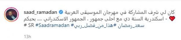 ونشر رمضان عبر صفحته الخاصة على تطبيق تبادل الصور(انستغرام)، مجموعة صور له خلال حفله بالإسكندرية، وعلق عليها قائلاً: " كان لي الشرف المشاركة في مهرجان الموسيقى العربية، الإسكندرية السنة دي مع أحلى جمهور، الجمهور الإسكندراني بحبكم".