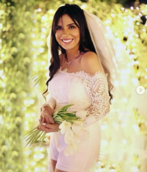 وعلقت على الصور التي نشرتها قائلةً: " مافيش أحلى من الجواز"، حيث ظهرت دينا بفستان زفاف نصفه الأسفل عبارة عن شورت قصير، مع طرحة بيضاء وباقة من الزهور.