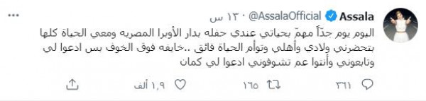نشرت الفنانة السورية أصالة نصري تغريدة عبر حسابها الخاص على موقع (تويتر) مساء الأحد، وقالت: " اليوم يوم جدّاً مهمّ بحياتي عندي حفله بدار الأوبرا المصريه ومعي الحياة كلها بتحضرني ولادي وأهلي وتوأم الحياة فائق، خايفه فوق الخوف".