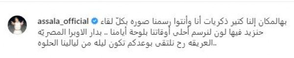 وجاء ذلك قبل مشاركتها في حدث بالعاصمة المصرية القاهرة يحضره أولادها وأهلها، وكانت أصالة قد أنهت البروفات الأخيرة استعدادا لحفلها فى دار الأوبرا المصرية ضمن مهرجان الموسيقى العربية، مساء الأحد.