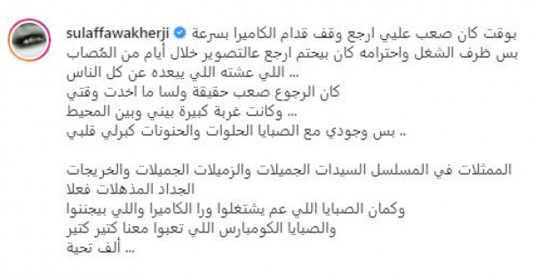 وعلقت فواخرجي على الصور التي نشرتها قائلةً: "بوقت كان صعب علي أرجع وقف قدام الكاميرا بسرعة بس ظرف الشغل واحترامه كان بيحتم أرجع عالتصوير خلال أيام من المُصاب اللي عشته اللي يبعده عن كل الناس".