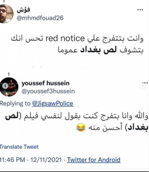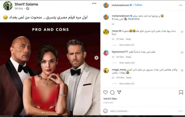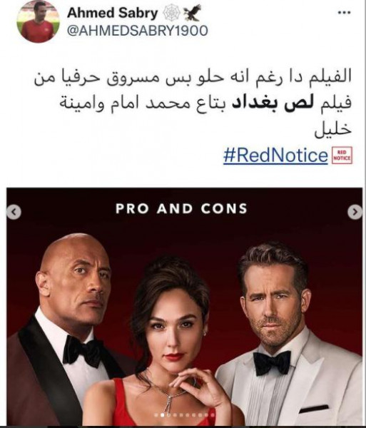 خرج الفنان المصر محمد إمام عن صمته، ليرد على الأخبار التي تناقلها رواد مواقع التواصل الإجتماعي، حول فيلم نجم المصارعة الحرّة وهوليوود داوين جونسون "ذا روك" الصخرة، "Red Notice"، نسخ بالكامل من فيلم الفنان المصري محمد أمام "لص بغداد".