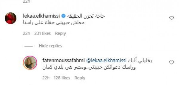 و علقت لقاء الخميسي معتذرة لفاتن موسى قائلة: "حاجة تحزن الحقيقة معلش حبيبتي حقك على راسنا"، لترد عليها فاتن موسى عليها:يخليلي ألبك وراسك دعواتكن حبيبتي..ومصر هي بلدي كمان".