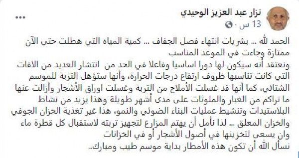 وقال الوحيدي، عبر صفحته بموقع (فيسبوك): "الحمد لله.. بشريات انتهاء فصل الجفاف، فكمية المياه التي هطلت حتى الآن ممتازة وجاءت في الموعد المناسب ونعتقد أنه سيكون لها دورًا أساسيًا وفاعلًا في الحد من انتشار العديد من الآفات التي كانت تناسبها ظروف ارتفاع درجات الحرارة".