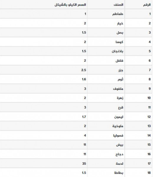 جاءت أسعار الخضروات والفواكه والدجاج واللحوم في قطاع غزة اليوم السبت كما يلي: