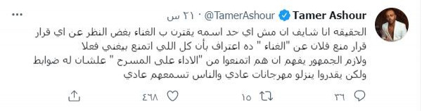 نشر الفنان المصري تامر عاشور تغريدة على حسابه الخاص على موقع (تويتر) بشأن قرار إيقاف نقابة الموسيقيين لعدد من مطربي المهرجانات، حيث قال: " الحقيقة أنا شايف أنو مش أي حد اسمه يقترن بـ الغناء بغض النظر عن أي قرار".