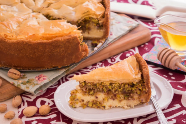 - تقطع أوراق الجلاش العلوية لقطع بحذر لاعطاءها شكل قطع الحلوى ويسهل تقطيعها بعد الخروج من الفرن ، يخبز القالب في فرن مسخن مسبقًا درجة حرارته ٢٠٠ مدة ٦٥ دقيقة إلى أن يأخذ اللون الذهبي و يتماسك خليط الجبن.