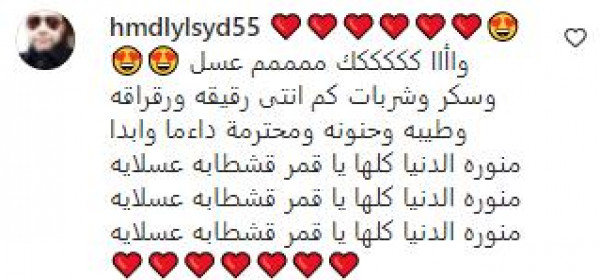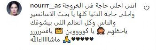 وعلقت أحد المتابعات وقالت: " إنتي أحلى حاجة في الخروجة وأحلى حاجة في الدنيا كلها، يا بخت الاسانسير والناس والعالم اللي بشوفك يا حظهم يا كوين يا قمر ماشاء الله".