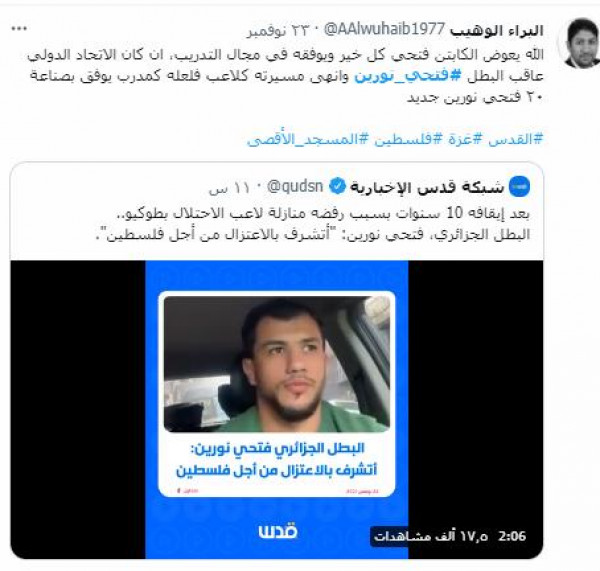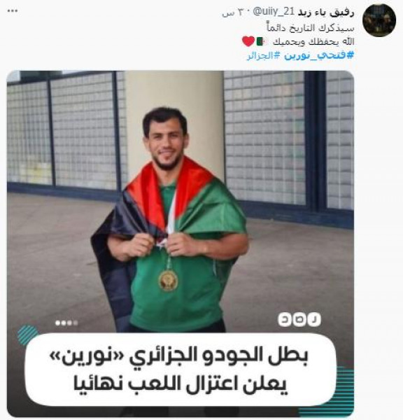 قرر بطل الجودو الجزائري فتحي نورين اعتزال اللعب نهائيًا، وذلك على خلفية قرار اللجنة الأولمبية بإيقافه 10 أعوام بعد انسحابه أمام لاعب إسرائيلي في أولمبياد طوكيو الأخير.