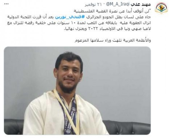 واختتم حديثه بالقول "أجدد شكري لكل المخلصين والداعمين لي في العالم، منذ قرار الانسحاب أمام لاعب الكيان الصهيوني بطوكيو حتى الآن".