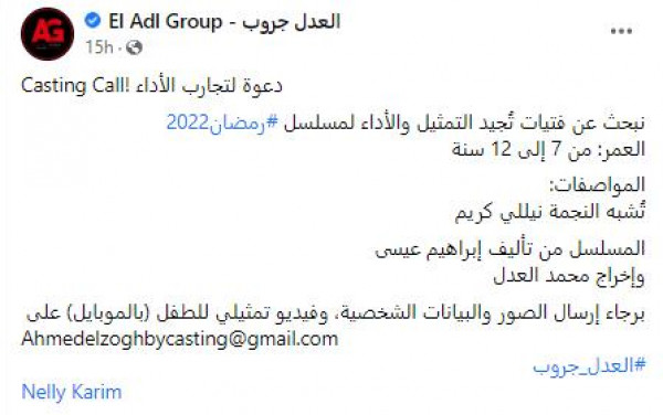 أثارت شركة (العدل جروب) المنتجة لمسلسل نيللي كريم الجديد ضجة كبيرة على مواقع التواصل الاجتاعي، بعد نشرها إعلان حول بحث الشركة عن طفلة شبيهة للفنانة نيللي كريم، وتحمل نفس مواصفاتها الشكلية.