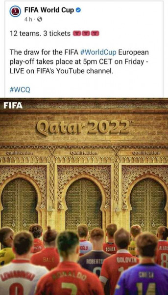 وتظهر الصورة التي نشرت على الصفحة الرسمية لكأس العالم نجوم كرة يقفون أمام باب عليه شعار "قطر2022"، فيما قال مغاربة إن الأبواب الثلاثة التي تظهر في الصورة هي إرث معماري مغربي أصيل، واتهموا قطر بـ"سرقته ونسبه إليها".