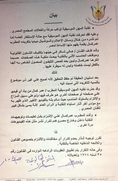 وقد حذرت نقابة المهن الموسيقية، المطرب عمر كمال، من بث أي فيديو، على صفحته، أو صفحات أخرى هو طرف فيها، ولو على سبيل المزاح، والالتزام بالسلوك المناسب؛ إذ إن ما تم بثه بالفيديو الآخير الذي ظهر به مع مؤدٍ آخر آثار استياء النقابة، والرأي العام؛ لأنه يسيء بشكل كبير للفنان المصري".